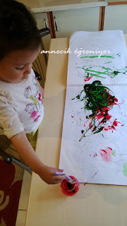 Yalnız Ceyda parmak boyasını eli pislendi diye önce hiç sevmedi.Parmağını boyaya sokunca ağlamaya başladı.:)) Kaşık ile boya yapabileceğini gösterince neyse ki iş tatlıya bağlandı. :)