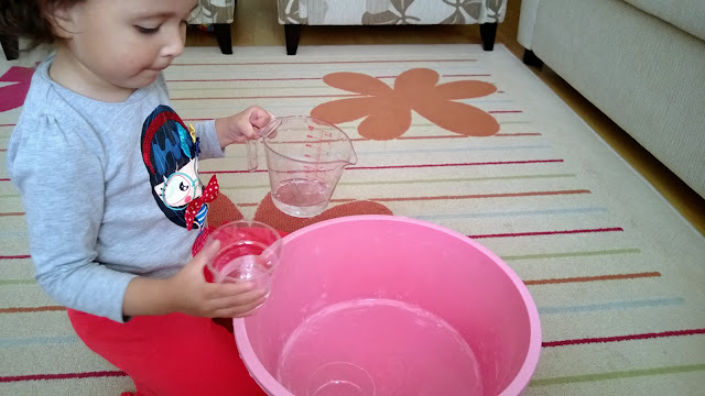 Ceyda ile uzun zamandır sulu oyun yapmamıştık. Aslında sonunun ne olacağını iyi bildiğim için ben yapmaktan kaçıyordum. Neyse yaşı biraz daha ilerlediği için belki daha düzgün oynar diye bugün sulu bir oyun yapalım dedim. Küçük ölçü kabına su koyup bardak ve de şişeye su doldurmasını söyledim. Gerçekten de düzelme var. Çok güzel oynadı.